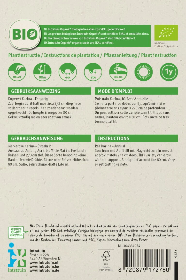 Intratuin Biologisch Groentezaden Doperwt (pisum Sativum ‘Karina’)