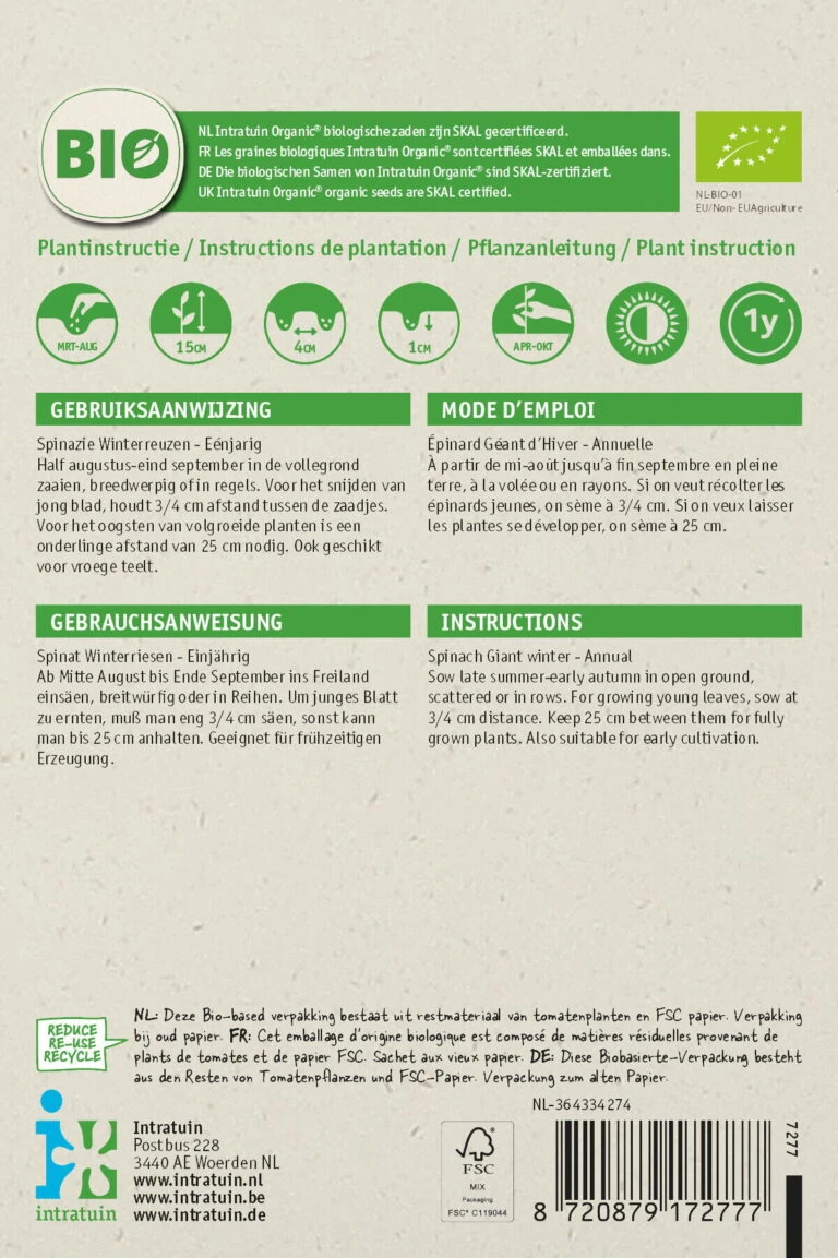 Intratuin Biologisch Groentezaden Spinazie (Spinacea Oleracea ‘Winterreuzen’)